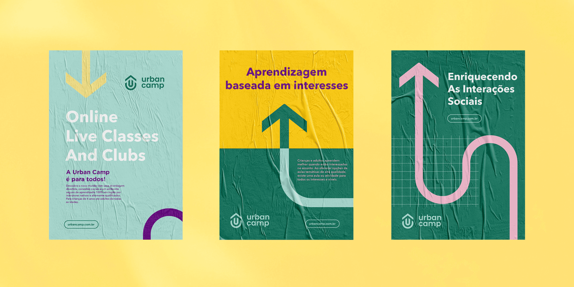 O sistema visual se comporta de maneira integrada em diferentes materiais de divulgação, evidenciando como a identidade pode sustentar comunicações diversas sem perder unidade. Ao articular conceito e expressão visual consistente, todo o sistema da marca permite que a Urban Camp se diferencie no mercado educacional.