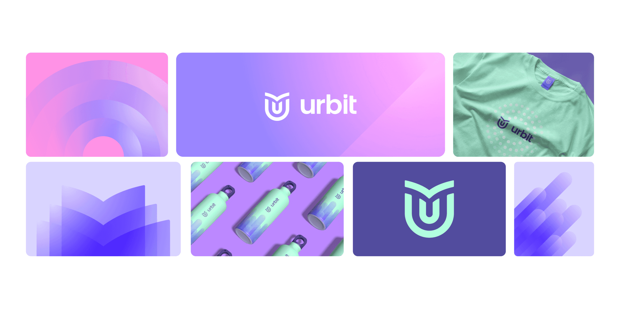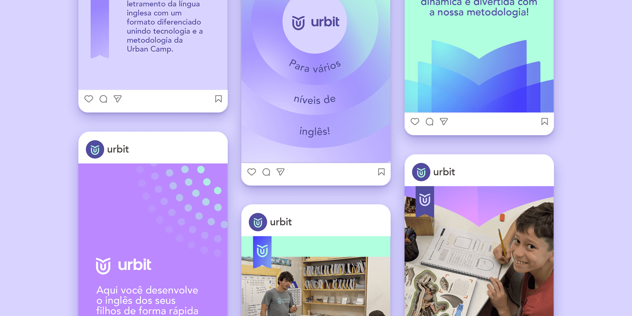 A paleta cromática desempenha papel central na diferenciação da marca. A identidade da Urbit se apoia em tons como roxo profundo, lilás, verde-menta, azul intenso e variações luminosas que transitam entre o violeta e o rosa. Uma combinação enérgica que expressa a criatividade e inovação da marca, atributos que dialogam com o universo educacional e com o público infantil e juvenil, ao mesmo tempo que mantém uma sofisticação que transmite confiança aos pais.
